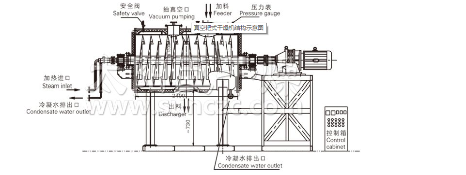 本机是一种新颖卧式间歇式真空干燥设备,湿物料经传导蒸发,带有刮板搅拌器不断热面上的物料,并在容器内推移形成循环流,水份蒸发后由真空泵抽出。